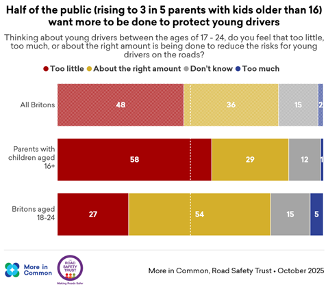 Almost half of Britons (48 per cent) think too little is being done to reduce the risks faced by young drivers, rising to 58 per cent among parents of children aged 16 or older.